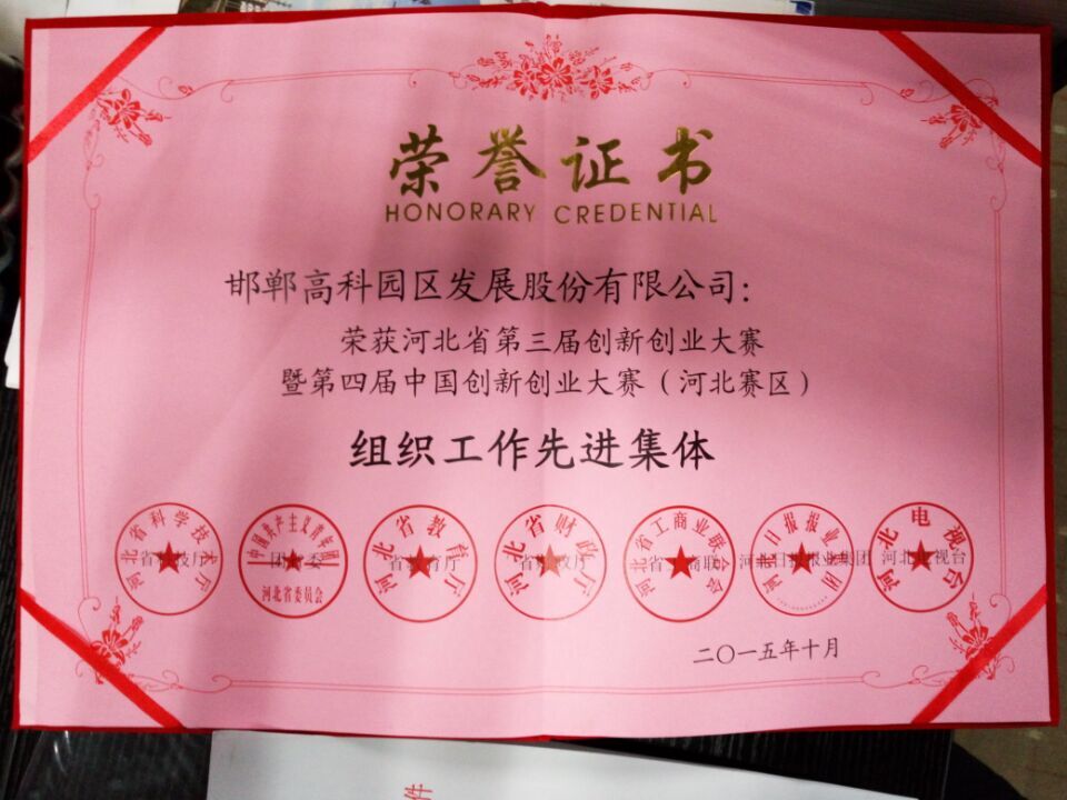 在本年度舉辦的河北省第三屆創(chuàng)新創(chuàng)業(yè)大賽暨第四屆中國創(chuàng)新創(chuàng)業(yè)大賽(河北賽區(qū))決賽中,邯鄲高科園憑出色組織工作,榮獲大賽的“組織工作先進(jìn)集體”獎。